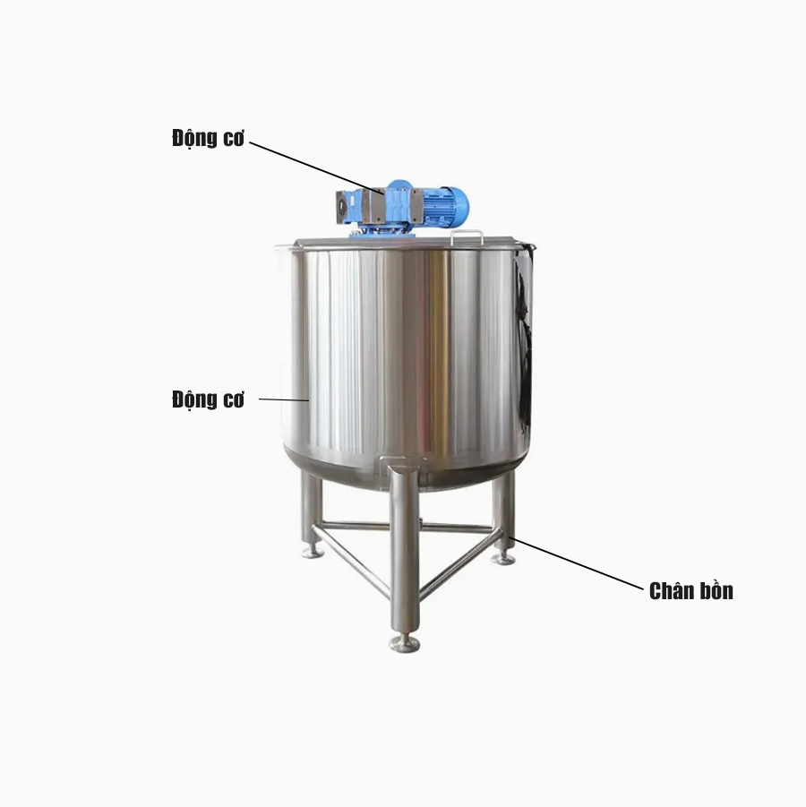Là phần chính chứa nguyên liệu cần khuấy. Thân bồn thường được làm bằng inox 304 hoặc inox 316, có khả năng chịu ăn mòn và chịu được hóa chất mạnh.