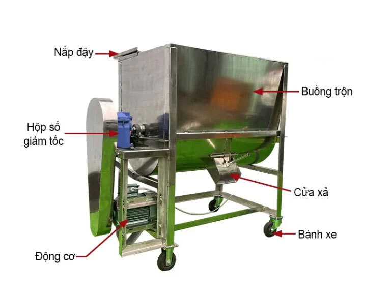 Thông thường, máy được thiết kế với khoang trộn có dung tích lớn, có thể chứa từ 400kg đến 2000kg vật liệu. Khoang trộn thường làm từ thép không gỉ hoặc kim loại được xử lý chống ăn mòn, giúp hạn chế rỉ sét và nâng cao tuổi thọ thiết bị. Bên trong, hệ thống trục vít xoắn đảm nhiệm vai trò hút nguyên liệu từ phía dưới đưa lên trên, đồng thời đảo trộn liên tục để hỗn hợp được đều và mịn.
